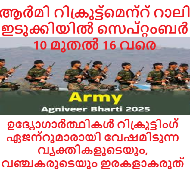 തിരുവനന്തപുരത്തെ ആർമി റിക്രൂട്ടിംഗ് ഓഫീസ് സംഘടിപ്പിക്കുന്ന അഗ്നിവീർ റിക്രൂട്ട്മെന്റ് റാലി (ആർമി) 2025 സെപ്റ്റംബർ 10 മുതൽ 16 വരെ ഇടുക്കി ജില്ലയിലെ നെടുങ്കണ്ടം പഞ്ചായത്ത് സ്റ്റേഡിയത്തിൽ നടത്തുന്നതാണ്.