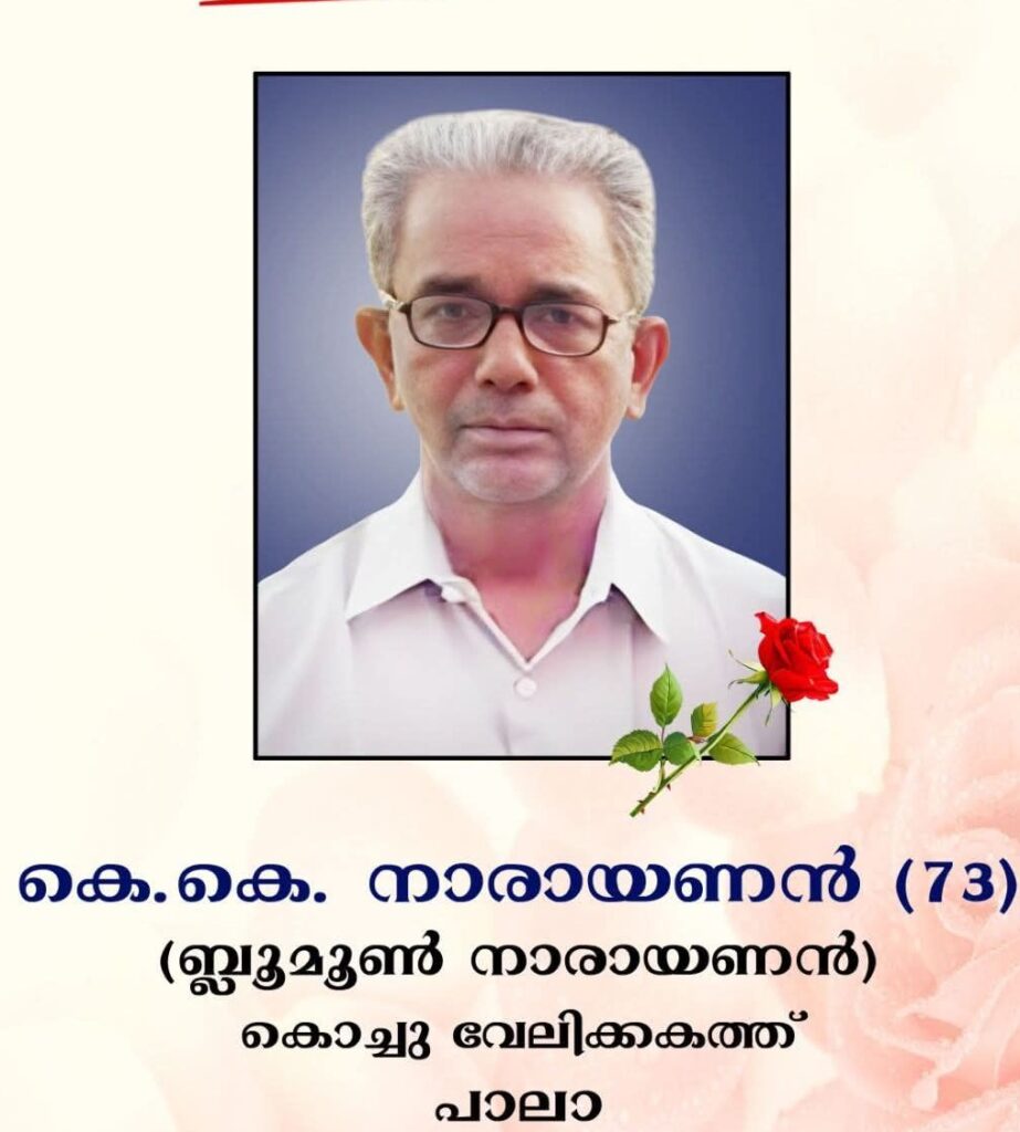 പാലാ: പാലായിലെ വ്യാപാര പ്രമുഖനായിരുന്ന കൊച്ചുവേലിക്കകത്ത് കെ.കെ. നാരായണന് (ബ്ലൂ മൂണ് നാരായണന്) വാഹനാപകടത്തില് മരിച്ചു. ഇന്നു രാവിലെ പാലായില് നാരായണന് സഞ്ചരിച്ച സ്കൂട്ടറില് കാര് വന്നിടിക്കുകയായിരുന്നു.ഇദ്ദേഹത്തെ തെള്ളകത്തെ കാരിത്താസ് ആശുപത്രിയില് പ്രവേശിപ്പിച്ചെങ്കിലും വൈകിട്ട് മൂന്നരയോടെ അന്തരിച്ചു. പാലായിലെ ബ്ലൂ മൂണ് ഹോട്ടല് ഉടമയാണ്. അപകടത്തില് പാലാ പോലീസ് കേസെടുത്തു.