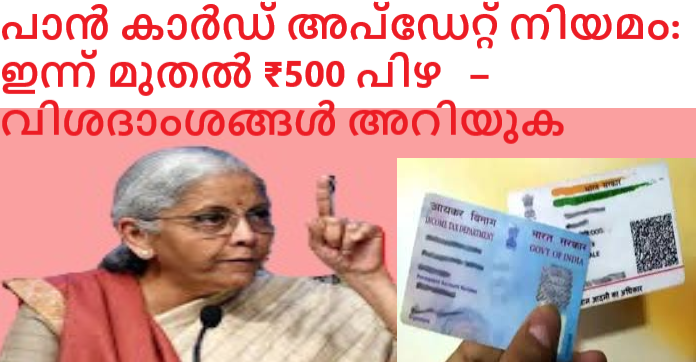 ന്യൂ ഡൽഹി :ഇന്ത്യയിൽ പാൻ കാർഡ് അപ്ഡേറ്റുകളുമായി ബന്ധപ്പെട്ട് ഇന്ന് മുതൽ ഒരു പ്രധാന മാറ്റം പ്രാബല്യത്തിൽ വന്നു. ആദായനികുതി വകുപ്പ് പുറപ്പെടുവിച്ച ഏറ്റവും പുതിയ നിർദ്ദേശം അനുസരിച്ച്, നിശ്ചിത സമയത്തിനുള്ളിൽ പാൻ കാർഡ് വിശദാംശങ്ങൾ അപ്ഡേറ്റ് ചെയ്യാത്ത വ്യക്തികൾ ഇപ്പോൾ 500 രൂപ പിഴ അടയ്ക്കേണ്ടിവരും. നികുതിദായകരുടെ രേഖകളിൽ കൃത്യതയും സുതാര്യതയും ഉറപ്പാക്കുന്നതിനും സാമ്പത്തിക അല്ലെങ്കിൽ നിയമപരമായ പ്രക്രിയകളെ ബാധിച്ചേക്കാവുന്ന പൊരുത്തക്കേടുകൾ ഇല്ലാതാക്കുന്നതിനും ഈ നീക്കത്തിലൂടെ ആദായനികുതി വകുപ്പ് ലക്ഷ്യമിടുന്നത് , ഇന്ത്യയിലെ നികുതിദായകർക്ക് അത്യാവശ്യമായ ഒരു തിരിച്ചറിയൽ ഉപകരണമാണ് പെർമനന്റ് അക്കൗണ്ട് നമ്പർ അഥവാ പാൻ. ഇത് ഒരു വ്യക്തിയെയോ സ്ഥാപനത്തെയോ അവരുടെ എല്ലാ സാമ്പത്തിക ഇടപാടുകൾ, ബാങ്ക് അക്കൗണ്ടുകൾ, നികുതി പേയ്മെന്റുകൾ, നിക്ഷേപങ്ങൾ എന്നിവയുമായി ബന്ധിപ്പിക്കുന്നു. എന്നിരുന്നാലും, കാലക്രമേണ, ആളുകൾ വിലാസങ്ങൾ, പേരുകൾ അല്ലെങ്കിൽ മറ്റ് വ്യക്തിഗത വിശദാംശങ്ങൾ മാറ്റുന്നു. അത്തരം മാറ്റങ്ങൾ പാൻ രേഖകളിൽ അപ്ഡേറ്റ് ചെയ്തില്ലെങ്കിൽ, അത് പൊരുത്തക്കേടുകൾക്കും നിയമപരമായ സങ്കീർണതകൾക്കും ഇടയാക്കും. ഉത്തരവാദിത്തവും സമയബന്ധിതമായ അപ്ഡേറ്റുകളും നടപ്പിലാക്കുന്നതിനായി ആണ് സർക്കാർ ഇപ്പോൾ ഈ പിഴ ഏർപ്പെടുത്തിയിരിക്കുന്നത് .