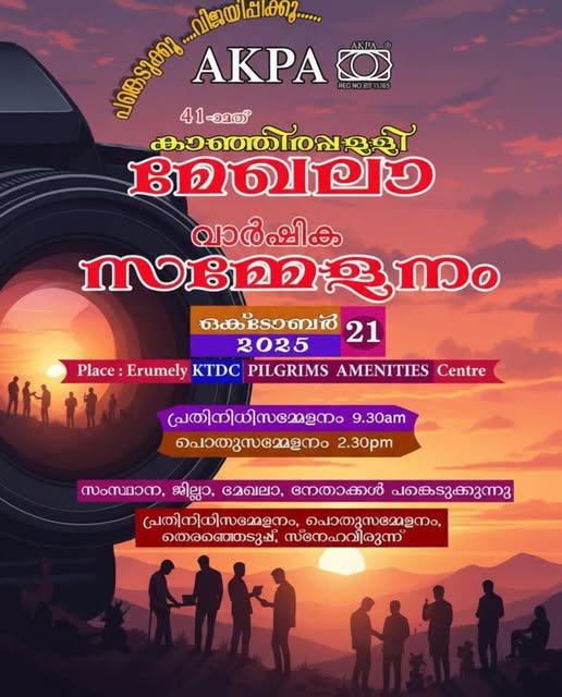 എരുമേലി: ഓൾ കേരള ഫോട്ടോഗ്രാഫേഴ്സ് അസോസിയേഷ ൻ 41-ാമത് കാഞ്ഞിരപ്പള്ളി മേഖലാ വാർഷിക സമ്മേളനം 21നു രാവി ലെ 9.30ന് എരുമേലി കെ.റ്റി.ഡി.സി.പിൽഗ്രിം സെൻ്ററിൽ നടക്കും. ജില്ലാ പ്രസിഡന്റ്റ് ഷാജി തോമസ് ഉദ്ഘാടനം ചെയ്യും.