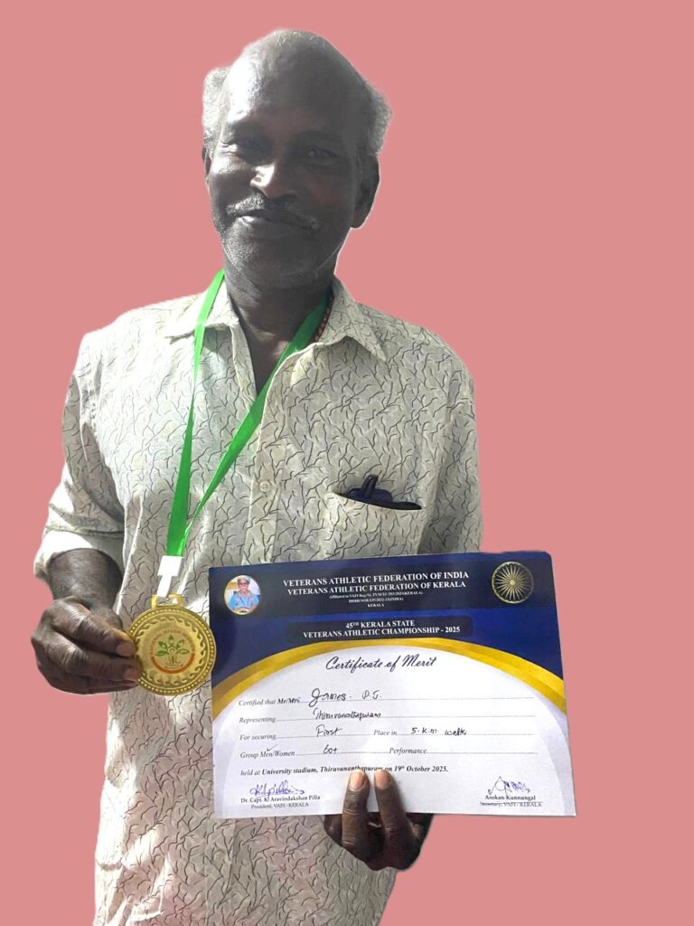 എരുമേലി :ചരള കണ്ണങ്കര കോളനി പടിപറമ്പിൽ ജെയിംസ് നടത്തിൽ നേടിയ സമ്മാനങ്ങൾ നിരവധി.കഴിഞ്ഞ ദിവസം തിരുവനന്തപുരത്ത് സെൻട്രൽ സ്റ്റേഡിയത്തിൽ സംസ്ഥാന വെറ്ററൻസ് അറ്റ്ലറ്റിക് ഫെഡറേഷൻ നടത്തിയ അഞ്ച് കിലോമീറ്റർ നടത്ത മത്സരത്തിൽ 60 വയസിന് മേലുള്ള വിഭാഗത്തിൽ ഒന്നാം സ്ഥാനവും സ്വർണ മെഡലും ലഭിച്ചു. 2023 ലും ഇതേ മത്സരത്തിൽ ജെയിംസ് ആണ് ഒന്നാം സ്ഥാനവും സ്വർണവും നേടിയത്. 2024 ൽ കുന്നംകുളത്ത് വെച്ച് നടന്ന കേരള സ്റ്റേറ്റ് വേറ്ററൻസ് അത്ലറ്റിക് ചാമ്പ്യൻഷിപ്പിൽ അഞ്ച് കിലോമീറ്റർ നടത്ത മത്സരത്തിലും സ്വർണ്ണ മെഡൽ നേടിയിരുന്നു.