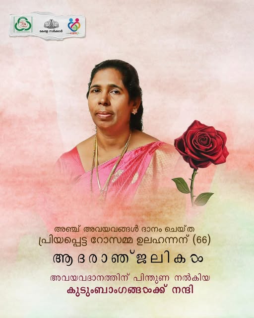 പാലാ: വാഹനമിടിപ്പിച്ചിട്ട് നിർത്താതെ പോയി ജീവൻ നഷ്ടപ്പെട്ട റോസമ്മ ഇനി അഞ്ച് പേർക്ക് ജീവിതത്തിൽ പ്രകാശമാകും. ഈ കഴിഞ്ഞ ദിവസം പാലായിൽ ഉണ്ടായ വാഹനാപകടത്തെ തുടർന്ന് മസ്തിഷ്കമരണം സംഭവിച്ച റോസമ്മ ഉലഹന്നാന്റെ അഞ്ച് അവയവങ്ങൾ ദാനം ചെയ്തു. കോട്ടയം പാലാ മുണ്ടുപാലം പുത്തേറ്റ് കുന്നേൽ വീട്ടിൽ റോസമ്മ ഉലഹന്നാന്റെ (66) രണ്ട് വൃക്കകൾ, കരൾ, രണ്ട് നേത്രപടലം എന്നിവയാണ് ദാനം ചെയ്തത്. ഒരു വൃക്ക കോട്ടയം സർക്കാർ മെഡിക്കൽ കോളേജിലേക്കും മറ്റൊരു വൃക്ക അമൃത ആശുപത്രിയിലേക്കും ഒരു കരൾ കോട്ടയം കാരിത്താസ് ആശുപത്രിയിലേക്കും രണ്ട് നേത്രപടലങ്ങൾ കോട്ടയം ചൈതന്യ കണ്ണാശുപത്രിയിലേക്കുമാണ് നൽകിയത്. തീവ്രദുഃഖത്തിലും അവയവം ദാനം ചെയ്യാന് സന്നദ്ധരായ ബന്ധുക്കളെ ആരോഗ്യ വകുപ്പ് മന്ത്രി വീണാ ജോര്ജ് നന്ദി അറിയിച്ചു. റോസമ്മ ഉലഹന്നാന് ആദരാഞ്ജലികള് അര്പ്പിക്കുകയും അദ്ദേഹത്തിന്റെ കുടുംബത്തിന്റെ ദുഃഖത്തില് പങ്കുചേരുന്നതായും മന്ത്രി പറഞ്ഞു.2025 നവംബർ അഞ്ചിന് രാത്രി 10.30ന് കടയിലെ ജോലി കഴിഞ്ഞ് ഭർത്താവ് ഉലഹന്നാൻ ജോസിനൊപ്പം ഓട്ടോറിക്ഷയിൽ വീട്ടിലേക്ക് മടങ്ങുകയായിരുന്നു റോസമ്മ. യാത്രാമധ്യേ, പാല സിവിൽ സ്റ്റേഷനിന് സമീപം ഉലഹന്നാൻ ജോസ് സാധനങ്ങൾ വാങ്ങാനായി ഓട്ടോറിക്ഷ നിർത്തിയിട്ട സമയത്ത്, ഓട്ടോറിക്ഷയിൽ ഇരിക്കുകയായിരുന്ന റോസമ്മയുടെ ഓട്ടോയുടെ പിന്നിൽ കാർ ഇടിക്കുകയായിരുന്നു. പാലാ സ്വദേശി തന്നെയായ ആനിത്തോട്ടം ജോർജുകുട്ടിയുടെ കാറാണ് റോസമ്മയെ ഇടിച്ചിട്ടതിനുശേഷം നിർത്താതെ പാഞ്ഞു പോയത്അപകടത്തിൽ ഗുരുതരമായി പരിക്കേറ്റ റോസമ്മയെ ഉടൻതന്നെ അടുത്തുള്ള സ്വകാര്യ ആശുപത്രിയിലും, തുടർന്ന് കോട്ടയം കാരിത്താസ് ആശുപത്രിയിലും പ്രവേശിപ്പിച്ചു.. നവംബർ 11ന് മസ്തിഷ്കമരണം സ്ഥിരീകരിച്ചതിനെ തുടർന്ന് കുടുംബാംഗങ്ങൾ അവയവദാനത്തിന് സമ്മതം അറിയിക്കുകയായിരുന്നു. കേരള സ്റ്റേറ്റ് ഓർഗൻ ആൻഡ് ടിഷ്യു ട്രാൻസ്പ്ലാന്റ് ഓർഗനൈസേഷനന്റെ (കെ-സോട്ടോ) നേതൃത്വത്തിലാണ് അവയവദാന നടപടിക്രമങ്ങളും ഏകോപനവും പൂർത്തിയായത്. രാജേഷ് ജോസഫ്, രാജീവ് ജോസഫ് (സോഫ്റ്റ് വെയർ എഞ്ചിനീയർ-ബാംഗ്ലൂർ), രശ്മി ജോൺ (യുകെ) എന്നിവരാണ് മക്കൾ.