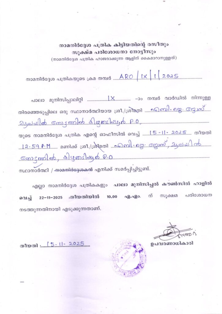 പാലാ:തെരഞ്ഞെടുപ്പുകളിലെ സംവരണം ജനാധിപത്യവിരുദ്ധമാണെന്നാരോപിച്ചു വനിതാ സംവരണ വാർഡിൽ നാമനിർദ്ദേശ പത്രിക നൽകി പുരുഷ സ്ഥാനാർത്ഥിയുടെ പ്രതിഷേധം. മഹാത്മാഗാന്ധി നാഷണൽ ഫൗണ്ടേഷൻ ചെയർമാൻ എബി ജെ ജോസാണ് പാലാ മുനിസിപ്പാലിറ്റി ഒൻപതാം വാർഡായ കൊച്ചിപ്പാടി വനിതാ സംവരണ വാർഡിൽ നാമനിർദ്ദേശ പത്രിക നൽകി പ്രതിഷേധിച്ചത്. പാലാ മുനിസിപ്പാലിറ്റിയിലെ ഉപവരണാധികാരി എ സിയാദ് മുമ്പാകെയാണ് പത്രിക സമർപ്പിച്ചത്. പത്രിക സ്വീകരിച്ച ഉപവരണാധികാരി ഇതുസംബന്ധിച്ചു രസീതും സൂക്ഷ്മപരിശോധനാ നോട്ടീസും കൈമാറി.