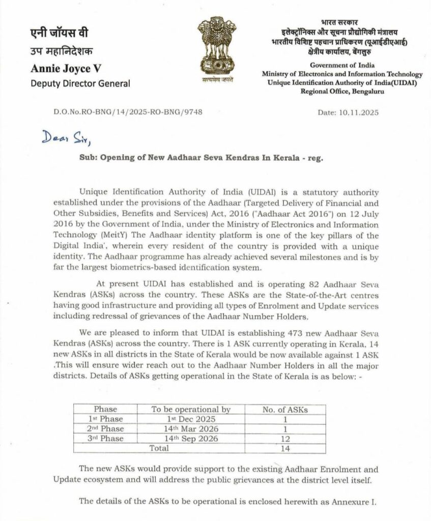 രാജ്യമൊട്ടാകെ 473 പുതിയ ആധാർ സേവനകേന്ദ്രങ്ങൾ തുറക്കും തിരുവനന്തപുരം : കേന്ദ്ര സർക്കാരിൻ്റെ UIDAI (Unique Identification Authority of India) എടുത്ത സുപ്രധാന തീരുമാന പ്രകാരം, കേരളത്തിൽ നിലവിലുള്ള ഒരു കേന്ദ്രത്തിന് പുറമേ 14 പുതിയ ആധാർ സേവാ കേന്ദ്രങ്ങൾ (ASKs) സ്ഥാപിക്കാൻ പോകുന്നതായി സുരേഷ് ഗോപി എം പി .സുരേഷ് ഗോപി തന്റെ ഫേസ് ബുക്ക് പേജ് വഴിയാണ് താൻ നടത്തിയ ഇടപെടലിനെക്കുറിച്ച് വിവരങ്ങൾ പങ്കുവച്ചത് .ഫേസ് ബുക്ക് കുറുപ്പ് “കേന്ദ്ര സർക്കാരിൻ്റെ UIDAI (Unique Identification Authority of India) എടുത്ത സുപ്രധാന തീരുമാന പ്രകാരം, കേരളത്തിൽ നിലവിലുള്ള ഒരു കേന്ദ്രത്തിന് പുറമേ 14 പുതിയ ആധാർ സേവാ കേന്ദ്രങ്ങൾ (ASKs) സ്ഥാപിക്കാൻ പോകുന്നു!ഇതിൽ എനിക്ക് ഏറ്റവും അഭിമാനകരമായ കാര്യം, ഈ അത്യാധുനിക കേന്ദ്രങ്ങളിൽ ഒന്ന് നമ്മുടെ തൃശ്ശൂരിൽ തന്നെ പ്രവർത്തനമാരംഭിക്കുന്നു എന്നതാണ്.”