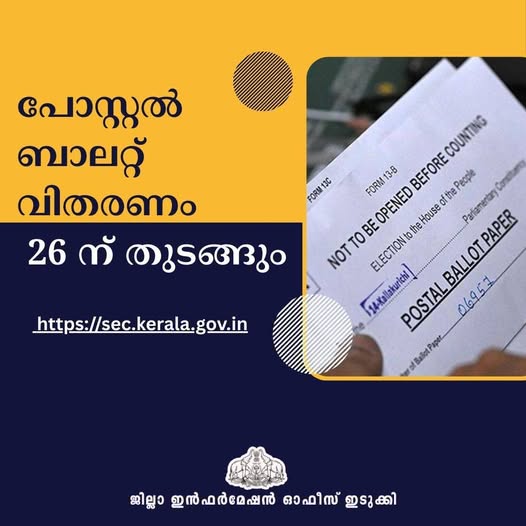 തദ്ദേശസ്വയംഭരണ തിരഞ്ഞെടുപ്പ് : പോസ്റ്റൽ ബാലറ്റ് വിതരണം 26 ന് തുടങ്ങും അപേക്ഷകൾ ലഭിക്കുന്ന മുറയ്ക്ക് തിരഞ്ഞെടുപ്പ് ഡ്യൂട്ടിയിലുള്ള സമ്മതിദായകർക്കുള്ള പോസ്റ്റൽ ബാലറ്റ് വിതരണം നവംബർ 26 മുതൽ ആരംഭിക്കും.തിരഞ്ഞെടുപ്പ് ഡ്യൂട്ടിയിൽ എർപ്പെടുന്ന ജീവനക്കാരെ അവരുടെ ഡ്യൂട്ടി നിർവചിച്ചും അതിലേക്ക് നിയോഗിച്ചും കൊണ്ട് ബന്ധപ്പെട്ട ജില്ലാ തിരഞ്ഞെടുപ്പ് ഉദ്യോഗസ്ഥർ, ജില്ലാ പോലീസ് മേധാവികൾ, വരണാകാരികൾ, ഉപവരണാധികാരികൾ എന്നിവർ യഥാസമയം ഉത്തരവ് പുറപ്പെടുവിക്കണമെന്ന് സംസ്ഥാന തിരഞ്ഞെടുപ്പ് കമ്മീഷൻ നിർദ്ദേശിച്ചു.തിരഞ്ഞെടുപ്പ് ഡ്യൂട്ടിക്ക് നിയോഗിക്കപ്പെട്ടവർ അവരെ തിരഞ്ഞെടുപ്പ് ഡ്യൂട്ടിയിൽ നിയോഗിച്ചുകൊണ്ട് പുറപ്പെടുവിച്ച ഉത്തരവിന്റെ ശരിപകർപ്പ് സഹിതം നിശ്ചിത ഫാറത്തിലും, സമയത്തിലും ആവശ്യപ്പെടുന്ന പക്ഷം പോസ്റ്റൽ ബാലറ്റ് പേപ്പറുകൾ നൽകേണ്ടതാണെന്ന് കമ്മീഷൻ എല്ലാ വരണാധികാരികൾക്കും നിർദ്ദേശം നൽകി. ത്രിതലപഞ്ചായത്തുകളെ സംബന്ധിച്ച് 3 ബാലറ്റുകളും മുനിസിപ്പാലിറ്റി, കോർപ്പറേഷൻ എന്നിവയിലേയ്ക്ക് ഓരോ ബാലറ്റുമാണ് നൽകേണ്ടത്.പോളിംഗ് ഡ്യൂട്ടിയുള്ള സമ്മതിദായകരുടെ തപാൽ വോട്ടിനുള്ള അപേക്ഷ കൃത്യമായി സ്വീകരിക്കുന്നതിനുള്ള ക്രമീകരണം ഏർപ്പെടുത്തണമെന്ന് ജില്ലാ തിരഞ്ഞെടുപ്പ് ഉദ്യോഗസ്ഥരോടും വരണാധികാരികളോടും കമ്മീഷൻ ആവശ്യപ്പെട്ടു.പോസ്റ്റൽ ബാലറ്റ് ലഭിക്കാൻ അർഹതയുള്ളവർ1. പോളിംഗ് സ്റ്റേഷനിൽ പോളിംഗ് ഡ്യൂട്ടിക്ക് നിയോഗിക്കപ്പെടുന്നവർ2. പോളിംഗ് ദിവസം തിരഞ്ഞെടുപ്പുമായി ബന്ധപ്പെട്ട മറ്റ് പ്രവർത്തനങ്ങളിൽ ഏർപ്പെടുന്ന സംസ്ഥാന തിരഞ്ഞെടുപ്പ് കമ്മീഷനിലെ മുഴുവൻ ജീവനക്കാർക്കും3. ജില്ലാ തിരഞ്ഞെടുപ്പ് ഓഫീസുകളിലെയും, പഞ്ചായത്ത്, മുനിസിപ്പാലിറ്റി, കോർപ്പറേഷൻ എന്നിവിടങ്ങളിലെയും ഇലക്ഷൻ വിഭാഗം ജീവനക്കാർ4. വരണാധികാരി, ഉപവരണാധികാരി എന്നിവരുടെ ഓഫീസുകളിലെ ഇലക്ഷൻ വിഭാഗം ജീവനക്കാർ5. ഒബ്സർവർമാർ6. സെക്ടറൽ ഓഫീസർമാർ7. ആന്റി ഡിഫെയ്സ്മെന്റ് സ്ക്വാഡിലെ ഉദ്യോഗസ്ഥർ8. തിരഞ്ഞെടുപ്പ് സുരക്ഷാ ചുമതലകളിൽ നിയോഗിക്കപ്പെടുന്ന പോലീസ് ഉദ്യോഗസ്ഥർപോസ്റ്റൽ ബാലറ്റിന് അപേക്ഷിക്കാംതിരഞ്ഞെടുപ്പ് ഡ്യൂട്ടിയിലുള്ള വോട്ടർമാർ പോസ്റ്റൽ ബാലറ്റിനായി ഫാറം 15 ൽ ബന്ധപ്പെട്ട വരണാധികാരിക്ക് അപേക്ഷ നൽകണം. അപേക്ഷ ഫാറം വരണാധികാരിയുടെ ഓഫീസിലും സംസ്ഥാന തിരഞ്ഞെടുപ്പ് കമ്മീഷൻ വെബ് സൈറ്റിലും (https://sec.kerala.gov.in/) ലഭിക്കും.അപേക്ഷ ബന്ധപ്പെട്ട വരണാധികാരികൾക്ക് വോട്ടെടുപ്പിന്