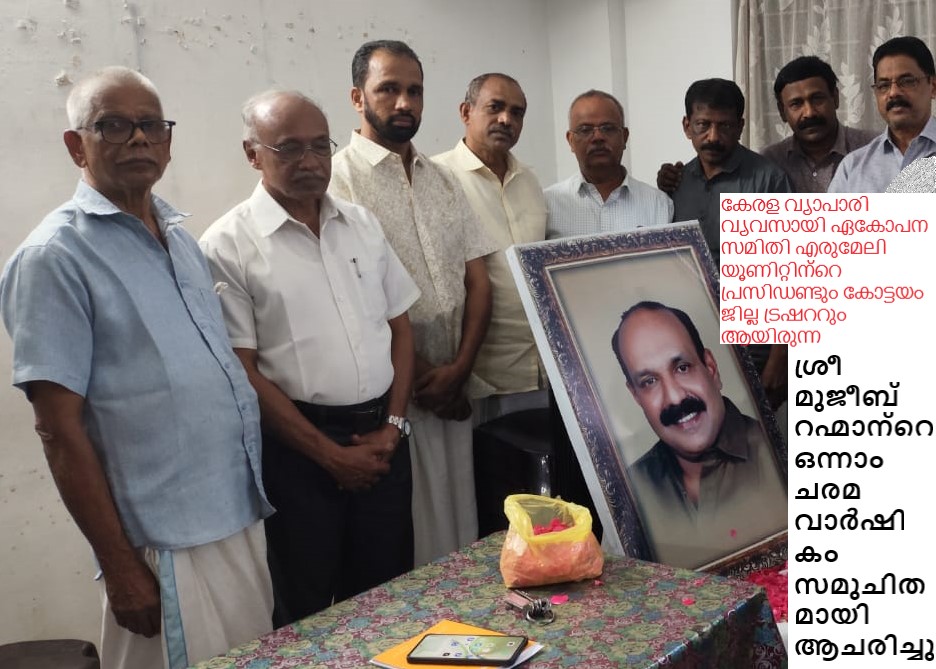എരുമേലി:കേരള വ്യാപാരി വ്യവസായി ഏകോപന സമിതി എരുമേലി യൂണിറ്റിന്റെ പ്രസിഡണ്ടും കോട്ടയം ജില്ല ട്രഷററും ആയിരുന്ന ശ്രീ മുജീബ് റഹ്മാന്റെ ഒന്നാം ചരമ വാർഷികം സമുചിതമായി ആചരിച്ചു. വ്യാപാരി വ്യവസായി എരുമേലി യൂത്ത് വിങ്ങിന്റെ അഭിമുഖത്തിൽ ടൗണിൽ മുജീബ് റഹ്മാന്റെ ഛായ ചിത്രത്തിൽപുഷ്പങ്ങൾ അർപ്പിച്ച് സ്മരണ പുതുക്കി. യൂണിറ്റ് കമ്മിറ്റിയുടെ ആഭിമുഖ്യത്തിൽ വ്യാപാര ഭവൻ ഹാളിൽ നടന്ന അനുശോചന സമ്മേളനത്തിൽ യൂണിറ്റ് പ്രസിഡണ്ട് തോമസ് കുര്യൻ ജനറൽ സെക്രട്ടറി പി ജെ ശശിധരൻ ട്രഷറർ സി പി മാത്തൻ മറ്റ് കമ്മിറ്റി അംഗങ്ങൾ തുടങ്ങിയവർ സ്മരണകൾ പങ്കുവെച്ച് ആദരാഞ്ജലികൾ അർപ്പിച്ചു