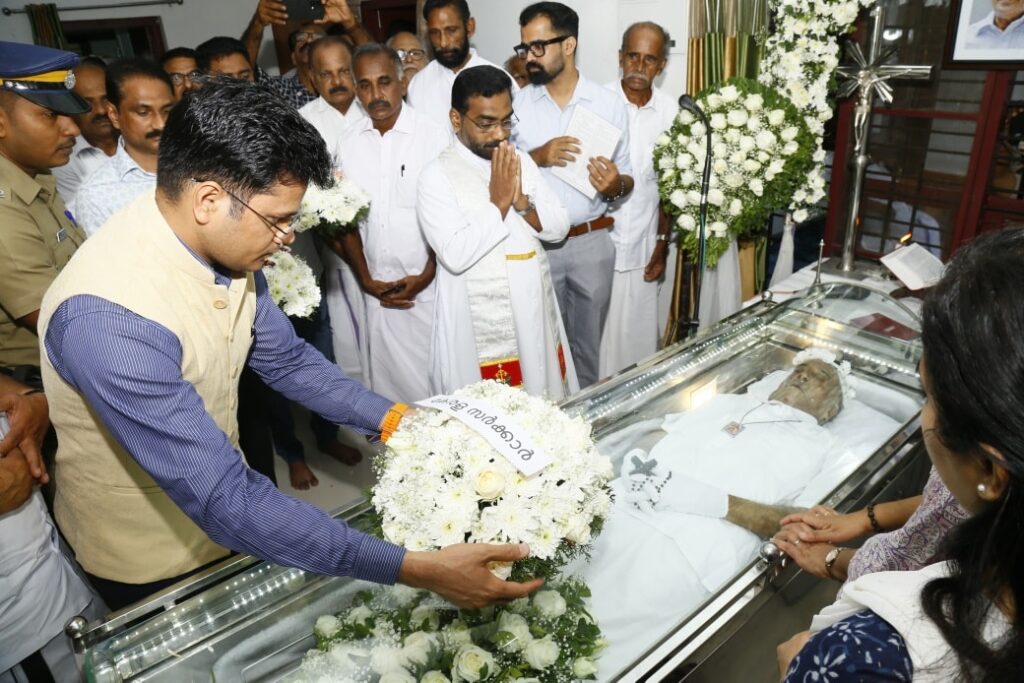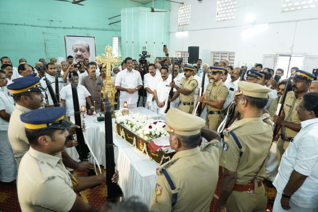 അന്തരിച്ച മുൻ എം.എൽ.എ പി.എം മാത്യുവിന് കടുത്തുരുത്തി സെന്റ് മേരീസ് ഫൊറോന പള്ളി (താഴത്തുപള്ളി) ഹാളിൽ പോലീസ് സംഘം ഔദ്യോഗിക ബഹുമതി അർപ്പിക്കുന്നു. അന്തരിച്ച മുൻ എം.എൽ.എ പി.എം മാത്യുവിന് സംസ്ഥാന സർക്കാരിനു വേണ്ടി ജില്ലാ കളക്ടർ ചേതൻ കുമാർ മീണ അന്ത്യോപചാരം അർപ്പിക്കുന്നു.