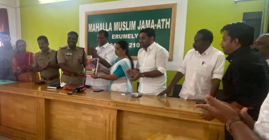 എരുമേലി :എരുമേലി ചന്ദനകുടആഘോഷത്തോടനുമ്പന്ധിച്ച് മഹല്ല ജമാ അത്ത് കമ്മിറ്റി പ്രസിദ്ധീകരിച്ച സുവനീർ പ്രകാശനം ചെയ്തു .കാഞ്ഞിരപ്പള്ളി ഡി വൈ എസ് പി :സാജു വർഗീസ് സുവനീർ കോപ്പി എരുമേലി ഗ്രാമ പഞ്ചായത്ത് പ്രസിഡന്റ് അമ്പിളി സജീവന് നൽകിയാണ് പ്രകാശനം നിർവഹിച്ചത് .പഞ്ചായത്ത് വൈസ് പ്രസിഡന്റ് സാറാമ്മ എബ്രഹാം ,എരുമേലി എസ് എച്ച് ഓ :ഡി ബിജു