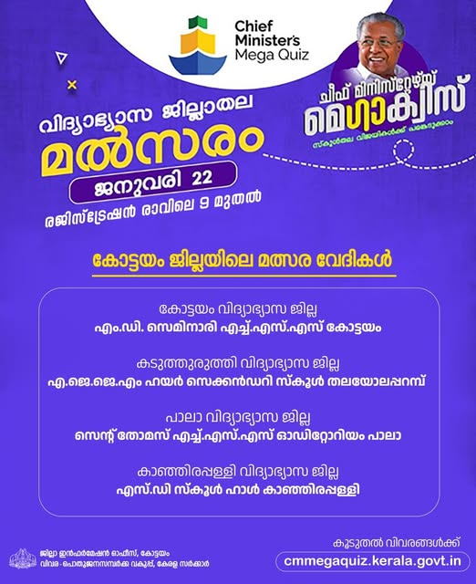കോട്ടയം: കേരളത്തിന്റെ സാമൂഹിക പുരോഗമന ചരിത്രം അടിസ്ഥാനമാക്കി സംസ്ഥാന സർക്കാർ സംഘടിപ്പിക്കുന്ന ചീഫ് മിനിസ്റ്റേഴ്‌സ് മെഗാ ക്വിസ് മത്സരത്തിലെ സ്‌കൂൾവിദ്യാർഥികൾക്കുള്ള വിദ്യാഭ്യാസജില്ലാതല മത്സരം ജനുവരി 22ന് (വ്യാഴാഴ്ച) നടക്കും. സ്‌കൂൾതല പ്രാരംഭഘട്ട മത്സരത്തിൽ വിജയികളായ രണ്ട് ടീമുകൾ വീതം വിദ്യാഭ്യാസ ജില്ലാ മത്സരത്തിൽ പങ്കെടുക്കും. രാവിലെ ഒൻപതു മുതൽ വിദ്യാഭ്യാസജില്ലയിലെ ക്വിസ് കേന്ദ്രങ്ങളിൽ രജിസ്‌ട്രേഷൻ ആരംഭിക്കും.
