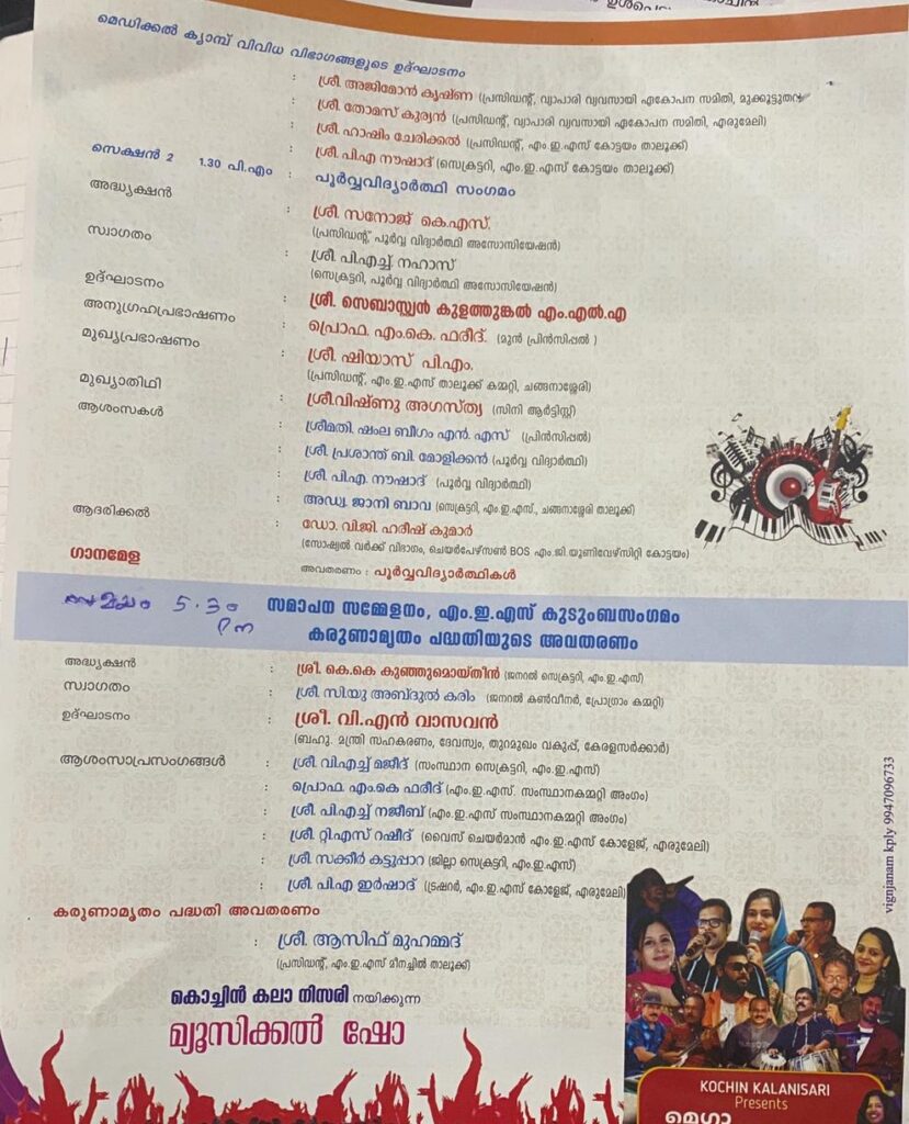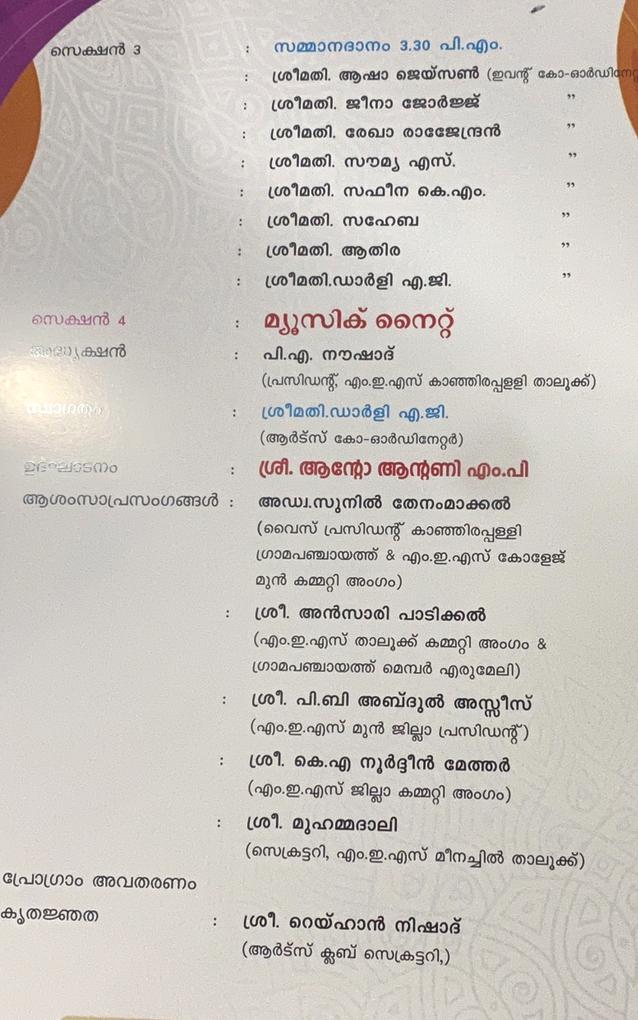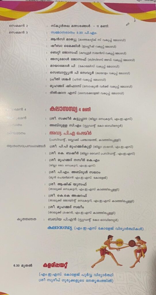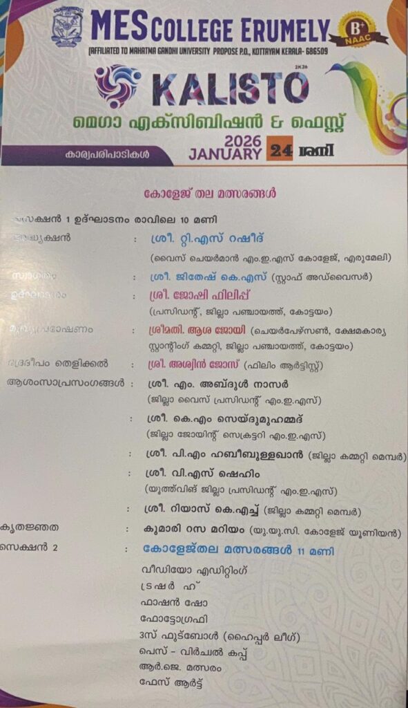 നടത്തും .വൈകുന്നേരം നാലിന് നടക്കുന്ന കലാസാംസ്ക്കാരിക സന്ധ്യ കാഞ്ഞിരപ്പള്ളി ബ്ലോക്ക് പഞ്ചായത്ത് പ്രസിഡണ്ട് അഡ്വ: പി എ ഷമീർ ഉൽഘാടനം ചെയ്യും.വൈകുന്നേരം 6.30ന് സുധീപ് ഗുരുക്കൽ അവതരിപ്പിക്കുന്ന കളരി പയറ്റ് ഉണ്ടായിരിക്കും. 24 ന് നടക്കുന്ന കോളേജ് തല മൽസരങ്ങൾ ജില്ലാ പഞ്ചായത്ത് പ്രസിഡണ്ട് ജോഷി ഫിലിപ്പ് ഉൽഘാടനം ചെയ്യും. സിനിമാ താരം അശ്വിൻ ജോസ് മുഖ്യാതിഥിയായിരിക്കും. നാലിന് നടക്കുന്ന സാംസ്ക്കാരിക സമ്മേളനവും കലാസന്ധ്യയും ആന്റോ ആൻ്റണി എംപി ഉൽഘാടനം ചെയ്യും. 25 ന് എം ഇ എസ് കോളേജിൽ വിദഗ്ധ ഡോക്ടർമാർ പങ്കെടുക്കുന്ന സൗജന്യ മെഡിക്കൽ ക്യാമ്പും മരുന്നുവിതരണവും ഉണ്ടായിരിക്കും. എരുമേലി പഞ്ചായത്ത് പ്രസിഡണ്ട് അമ്പിളി സജീവൻ ഉദ്ഘാടനം ചെയ്യും.പൂർവ്വ വിദ്യാർത്ഥി സംഗമം അഡ്വ: സെബാസ്റ്റ്യൻ കുളത്തുങ്കൽ എം എൽ എ ഉദ്ഘാടനം ചെയ്യും .വൈകുന്നേരം 5 ന് ചേരുന്ന സമാപന സമ്മേളനം