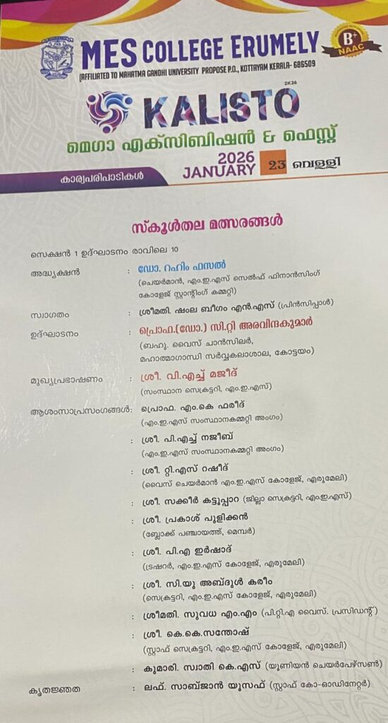 മെഗാ ഫെസ്റ്റ് വെളളിയാഴ്ച രാവിലെ പത്തിന് എം ജി സർവ്വകലാശാല വൈസ് ചാൻസലർ പ്രഫ: സി ടി അവിന്ദകുമാർ ഉൽഘാടനം ചെയ്യും.എം ഇ എസ് സെൽഫ് ഫിനാൻസിങ് കോളേജ് കമ്മിറ്റി അധ്യക്ഷൻ ഡോ: റഹീം ഫസൽ മുഖ്യ പ്രഭാഷണം