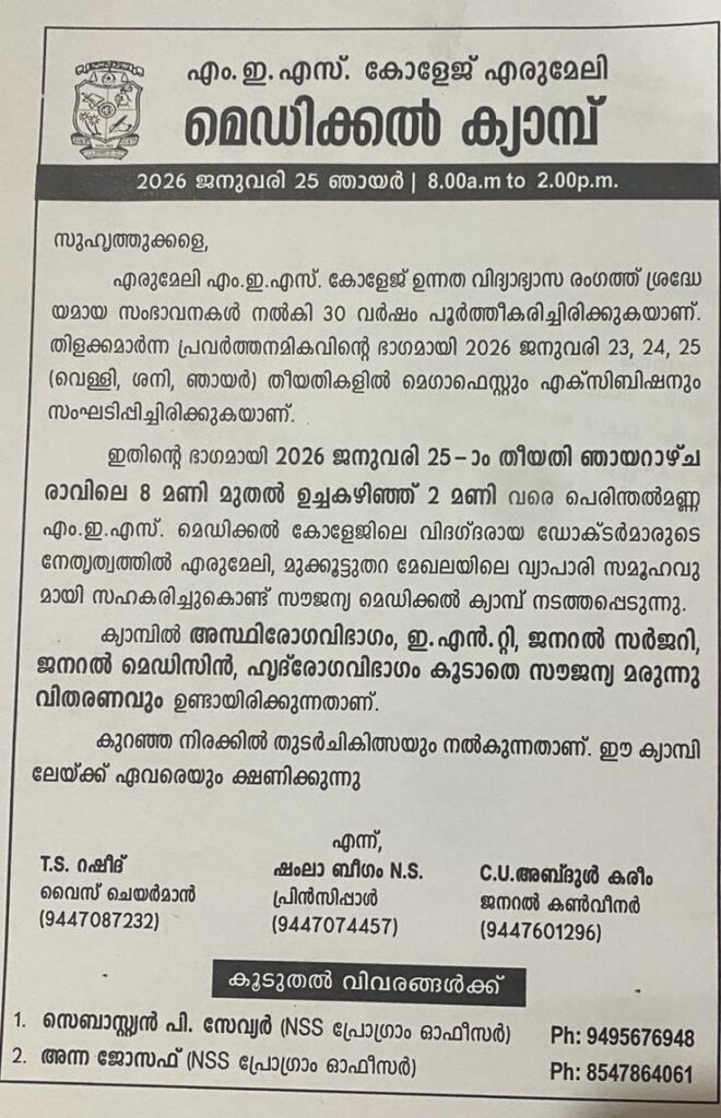 25 ന് എം ഇ എസ് കോളേജിൽ വിദഗ്ധ ഡോക്ടർമാർ പങ്കെടുക്കുന്ന സൗജന്യ മെഡിക്കൽ ക്യാമ്പും മരുന്നുവിതരണവും ഉണ്ടായിരിക്കും എരുമേലി :എരുമേലി എം ഇ എസ് കോളേജിൻ്റെ 30-ാം വാർഷികാഘോഷത്തിൻ്റെ ഭാഗമായി ജനുവരി 23 മുതൽ 26 വരെ തിയതികളിൽ മെഗാ ഫെസ്ററും പ്രദർശനവും -“കലിസ്റ്റോ” നടക്കുമെന്ന് ഭാരവാഹികൾ വാർത്താ സമ്മേളനത്തിൽ അറിയിച്ചു.