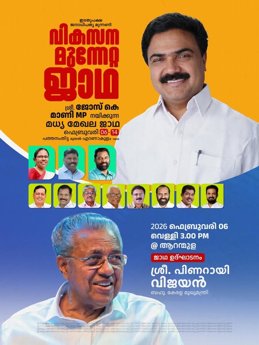 ഇടതുമുന്നണിയുടെ മധ്യമേഖല വികസന മുന്നേറ്റ ജാഥക്ക് നാളെ പത്തനംതിട്ടയിൽ തുടക്കം ,ജോസ് കെ മാണി ക്യാപ്റ്റൻ ,ഉദ്‌ഘാടനം പിണറായി വിജയൻ നിർവഹിക്കും.