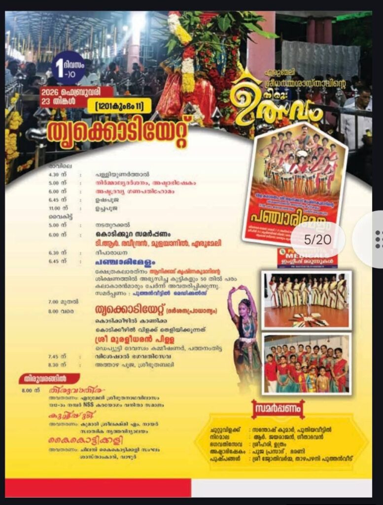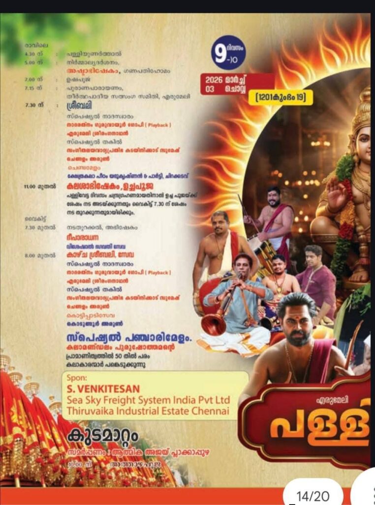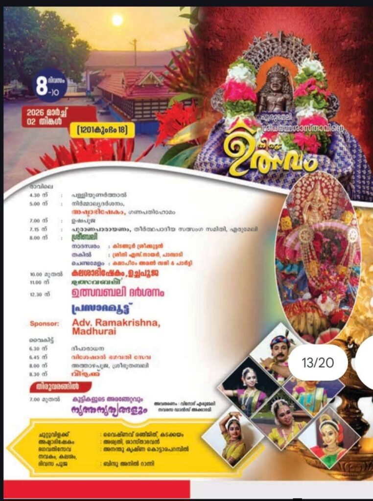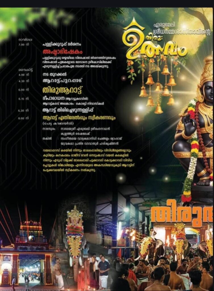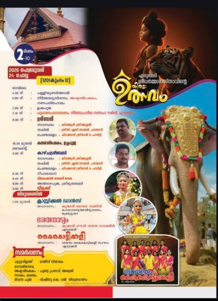 എരുമേലി :എരുമേലി ശ്രീധർമ്മശാസ്താ ക്ഷേത്രോത്സവത്തിന് ഇന്ന് കൊടിയേറും.വൈകിട്ട് ഏഴിന് ശേഷം തന്ത്രി താഴമൺ മഠം കണ്ഠര് ബ്രഹ്മദത്തന്റെ മുഖ്യ കാർമ്മികത്വത്തിലും മേൽശാന്തി രാജേഷ് നമ്പൂതിരിയുടെയും ,കീഴ്ശാന്തി അജയകൃഷ്ണന്റെ സഹകാർമ്മികത്വത്തിലുമാണ് കൊടിയേറ്റ് ..മാർച്ച് 2 ന് ഉത്സവബലിയും മാർച്ച് മൂന്നിന് പള്ളിവേട്ടയും നടക്കും .മാർച്ച് നാലിനാണ് ആറാട്ട് .ഇന്ന് വൈകിട്ട് 5 ന് കൊടിക്കൂറ സമർപ്പണം .8.45 ന് പഞ്ചാരിമേളം .ആനിക്കാട് കൃഷ്ണകുമാറിന്റെ നെത്ര്വതത്തിൽ 50 ൽ പരം മേളകലാകാരന്മാർ പങ്കെടുക്കും ..ദിവസവും രാവിലെ 7.45 ന് ഭഗവതി സേവ.8.30 ന് ശ്രീഭൂതബലി ,പുരാണപാരായണം ,കാഴ്ചശ്രീബലി ,കലശാഭിഷേകം ,വിളക്ക് എന്നിവ നടക്കും .ഉത്സവത്തിന്റെ രണ്ടാം ദിവസമായ നാളെ വൈകിട്ട് ഏഴുമുതൽ അരങ്ങിൽ കുമാരി വൈഗ രാജീവിന്റെ ക്ലാസിക്കൽ ഡാൻസ് ,ഗൗരി നന്ദന റോബിന്റെ ഭരതനാട്യം ,ലയനം കൈകൊട്ടിക്കളി സംഘത്തിന്റെ അവതരണം എന്നിവ ഉണ്ടായിരിക്കും .
