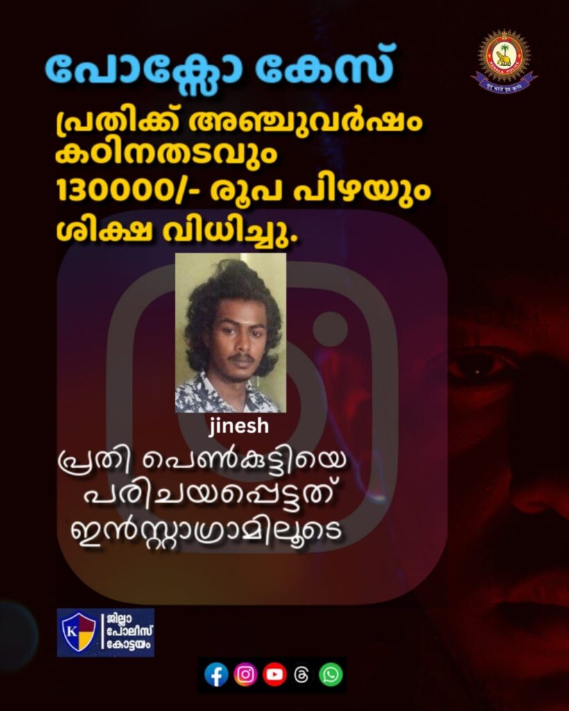 അയർകുന്നം :അയർകുന്നം പോലീസ് സ്റ്റേഷനിൽ രജിസ്റ്റർ ചെയ്ത കേസ്സിൽ വയനാട് സ്വദേശിയായ ജിനേഷ് പി സി, 23 വയസ്സിനെയാണ് കോട്ടയം ഫാസ്റ്റ് ട്രാക്ക് സ്പെഷ്യൽ കോടതി 5 വർഷം കഠിനതടവിനും 130000 രൂപ പിഴയും ശിക്ഷ വിധിച്ചത്. 2023 ഒക്ടോബർ മാസം പെൺകുട്ടിയുമായി ഇൻസ്റ്റാഗ്രാം വഴി പരിചയം സ്ഥാപിച്ച പ്രതി കുട്ടിയുടെ നഗ്നചിത്രങ്ങൾ അയച്ചു വാങ്ങി പെൺകുട്ടിയെ ലൈംഗികചൂഷണം നടത്തുകയായിരുന്നു. കോട്ടയം ഫാസ്റ്റ് ട്രാക്ക് കോടതി ജഡ്ജി റോഷിനി എച്ച് ആണ് ശിക്ഷ വിധിച്ചത്. കേസ്സിൽ പ്രോസിക്യൂഷന് വേണ്ടി സ്പെഷ്യൻ പബ്ലിക് പ്രോസിക്യൂട്ടർ അഡ്വ പോൾ കെ എബ്രഹാമും പ്രതിക്ക് വേണ്ടി അഡ്വ ലിതിൻ തോമസ്സും ഹാജരായി. SI ലെബിമോൻ KS SI സാജു T ലുക്കോസ് SCPO സരുൺ രാജ് CPO ബിങ്കർ G എന്നിവരടങ്ങുന്ന പോലീസ് സംഘമാണ് ഈ കേസിലെ അന്വേഷണ ചുമതലയിൽ ഉണ്ടായിരുന്നത്.