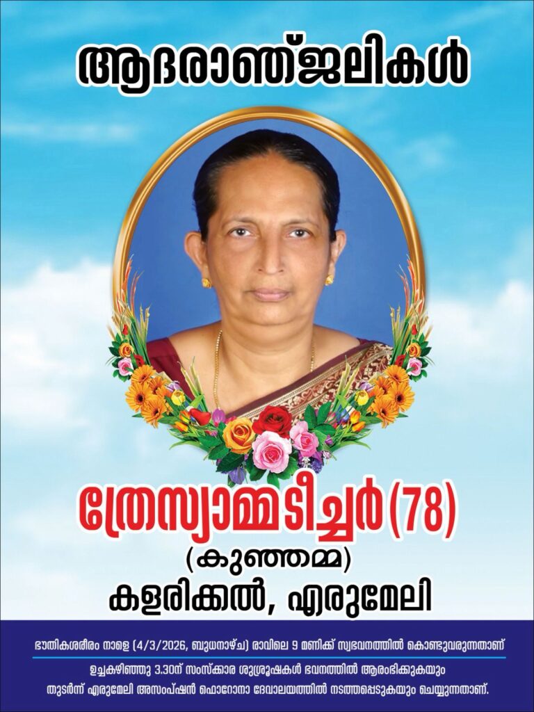 എരുമേലി:കഴിഞ്ഞ ദിവസം അന്തരിച്ച കളരിക്കൽ ത്രേസ്യാമ്മ ടീച്ചറുടെ സംസ്കാരം 04/03/2026 ബുധനാഴ്ച 4 മണിക്ക് എരുമേലി അസംപ്ഷൻ ഫൊറോനാ പള്ളി സെമിത്തേരിയിൽ നടക്കും . ബുധനാഴ്ച രാവിലെ 9 മുതൽ വീട്ടിൽ ആദരാഞ്ജലികൾ അർപ്പിക്കാവുന്നതാണ് .സംസ്കാര ശുശ്രൂഷകൾ 3.30 മണിക്ക് ആരംഭിക്കും