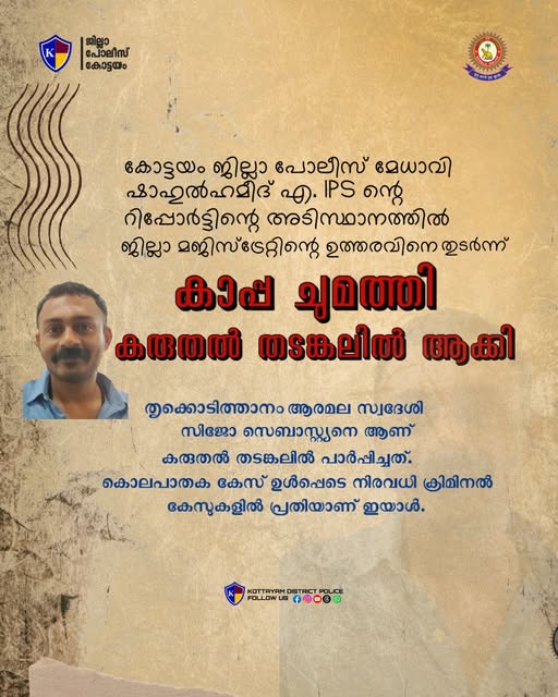 കാപ്പാ ഉത്തരവ്: കുപ്രസിദ്ധ ഗുണ്ട സിജോ സെബാസ്റ്റ്യൻ കരുതൽ തടങ്കലിൽ